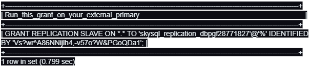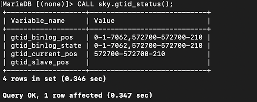 1MariaDB [(none)]> CALL sky.change_external_primary_gtid(dbtwf12345678.syst0000.test1.skysql.com, 3306, 0-1-7062,572700-572700-210, true); When you run the above command, you’ll see an output similar to the following.